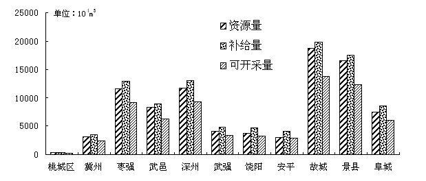 m3。各县、市、区地下水资源量、补给量、可开采量见图